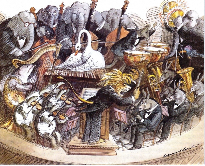 Silfidi di Berlioz. E tra i fossili (i famosi critici musicali) di cui l’autore si prende gioco, cita la sua stessa Danza macabra, insieme a tre canzoni popolari e a un frammento del Barbiere di Siviglia di Rossini. Una burla, dunque, uno scherzo, una maschera, una smorfia, una linguaccia, qualcosa che sfugge di mano come i coriandoli a Carnevale. Un mondo al contrario, pieno di animali saltanti, che superano, nel prodigio ineffabile della musica, anche i propri limiti anatomici e la forza di gravità: leoni ruggenti, cigni soffici e delicati, ma anche canguri che insegnano agli elefanti come slanciarsi verso il cielo senza paura, pesci che guizzano nei loro “glissando” luminosi, per rotolare forse nell’aria…Una metafora della vita, che si sposta tra acqua, aria e terra in un continuum armonico sempre nuovo e imprevedibile, come la musica. In un progressivo crescendo…crescendo, trascinante fino al… finale!