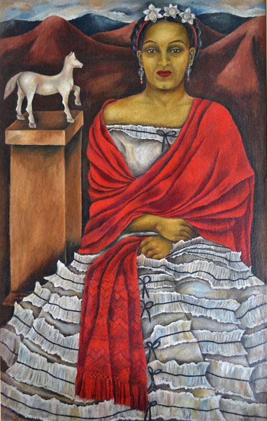 Il suo autoritratto del 1940 riflette l’obiettivo della sua produzione artistica. Come in molti suoi autoritratti, si vede la ricerca delle sue radici messicane. L’artista indossa un abito bianco a balze che ricorda il costume regionale di Veracruz, uno dei trentuno stati che compongono il Messico e si trova nella zona orientale. Il vestito contrasta con il rebozo rosso, una sorta di scialle tipico indossato dalle donne messicane, che le copre le spalle. Questi colori sono un riferimento alla bandiera messicana. Dietro di lei, vediamo un piccolo cavallino di legno, che fa riferimento ai modellini che aveva usato durante il suo percorso artistico.