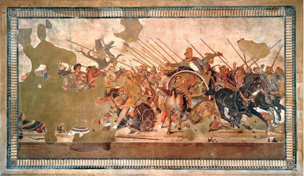 Per molto tempo nella storia dell’arte, la guerra è stata celebrata. Sono innumerevoli le opere che rappresentano battaglie, spesso dipinte per esaltare la gloria di personaggi potenti. Un esempio è il mosaico della Battaglia di Isso, che celebra la vittoria di Alessandro Magno sul re Dario. Questo mosaico, proveniente da Pompei, si trova oggi nel Museo Archeologico Nazionale di Napoli. Nonostante i dettagli drammatici, come un cavallo e un uomo a terra, la celebrazione della superiorità di Alessandro è lampante. È interessante notare che, nonostante la drammaticità della scena, non ci siano raffigurati cadaveri o figure esplicitamente decedute.