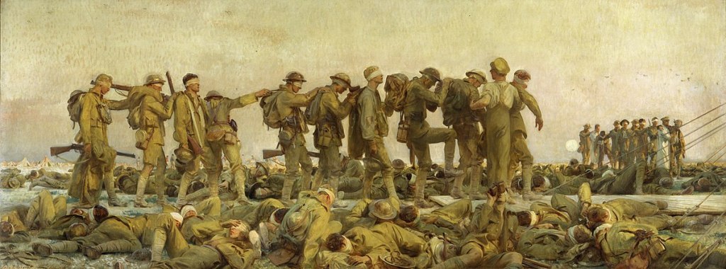 Nel Novecento inizia a farsi strada l’atrocità della guerra, che diventa un tema fondamentale. Già nella Prima Guerra Mondiale iniziano ad essere utilizzate nuove tattiche. “Gassed” è il titolo di quest’opera di Sargent che rappresenta una fila di soldati dagli occhi bendati che camminano sui corpi dei loro compagni per ritirarsi.